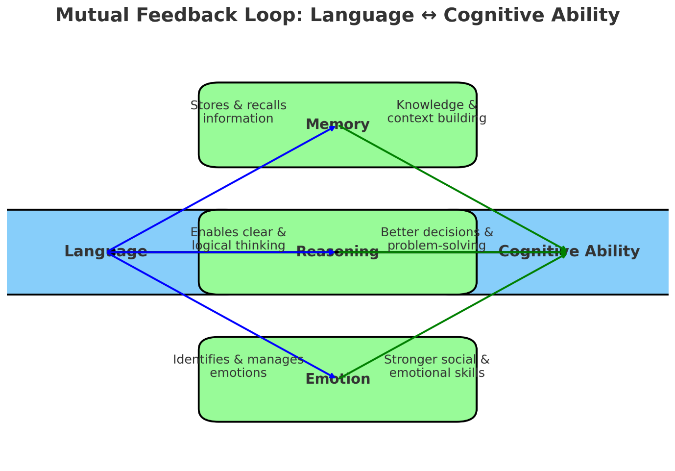Consequently, the link between language and cognitive ability is deep and bidirectional, ie language both reflects and shapes how we think, remember, solve problems and make decisions.