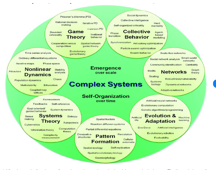 The 7 components (the 3 on the left of the diagram above - game theory, nonlinear dynamics and systems theory - provide the historical background; the other 4 - pattern formation, evolution and adaptation, networks and collective behaviour - are more recent additions.)