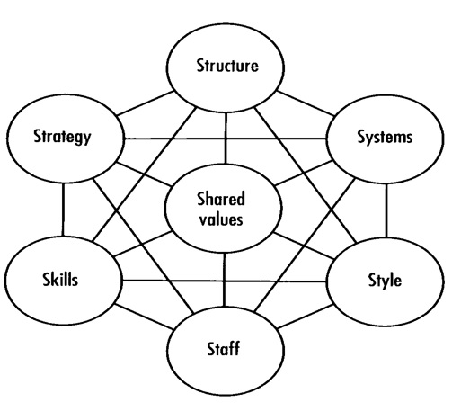 The 7-S framework explains the supporting elements that are crucial for success. It contains 3 "hard" elements, 3 'soft' elements and the 7th in the middle (shared values of the organisation).