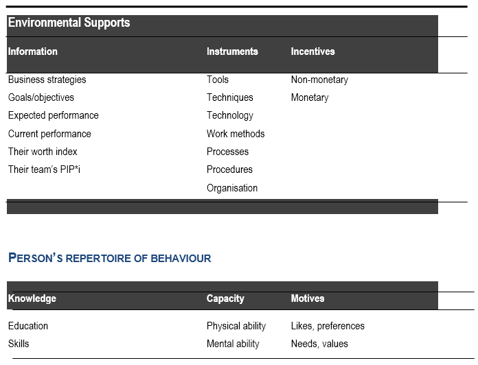 . Employees require certain environmental supports in order to function effectively. In the case of a person's repertoire of behaviour, there are 3 environmental supports - information, instruments and incentives; people need