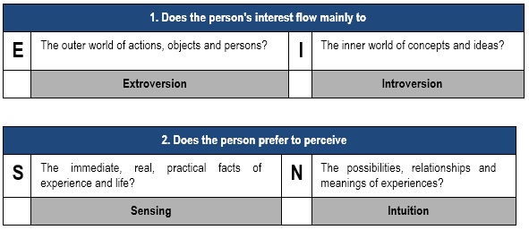 ‐ intuitive (information is acquired as patterns or global wholes with focus on inter‐relationships, meanings and possibilities in the future)