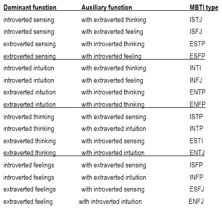 The dominant and auxiliary functions can be combined into 16 MBTI types: