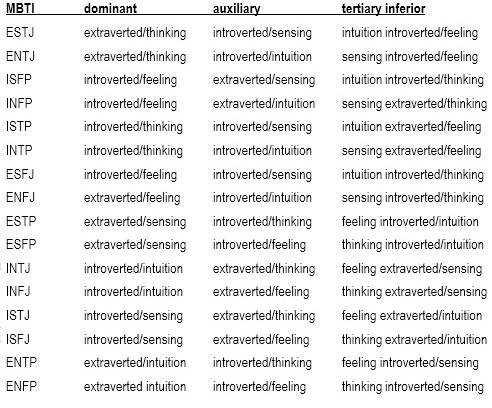 "...a person's dominant function is typically used in the direction of the preferred attitude ‐ either extraversion or introversion. A person's auxillary function is usually used in the direction of the opposite, not preferred attitude ‐ if the dominant is extraversion, the auxillary is introverted, and vice versa. A person's tertiary function maybe used in either direction, depending on circumstances or individual habits. A person's inferior function is typically used in the opposite direction to that of the dominant ‐ if the dominant is introverted, the inferior is extraverted, and vice versa......the inferior function is largely unconscious ‐ we don't direct and control it. Its unconscious energy interrupts and takes over our personality when a conscious energy diminishes sufficiently. We often remain unaware of the change in ourselves until the experience is over..."