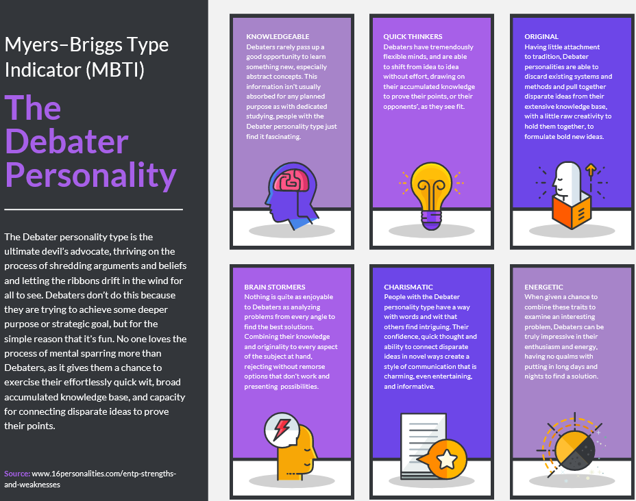 ‐ ENTP, ie inventive, analytical planner of change; enthusiastic and independent; inspiration with impulsive energy; seeks to understand and inspire others
