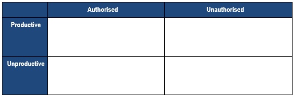 Thus, the task is to allocate different activities to 1 of 4 quadrants of the matrix (authorised or unauthorised that are either productive or unproductive), ie