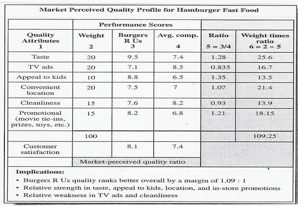 i. market perceived quality profile - which examines the key purchase criteria of customers for product and/or service under analysis. Customers are asked to rank their purchase criteria, ie out of a possible 100 points. Then they are asked to rank the performance of the organisation and its rivals in delivering each purchase criteria. Then each organisation's score on each purchase criterion is multiplied by the weight assigned to that particular criterion. Adding up each organisation's total score will yield a market perceived quality profile. Sometimes, conjoint or regression analysis or ratio scales are used. For example,