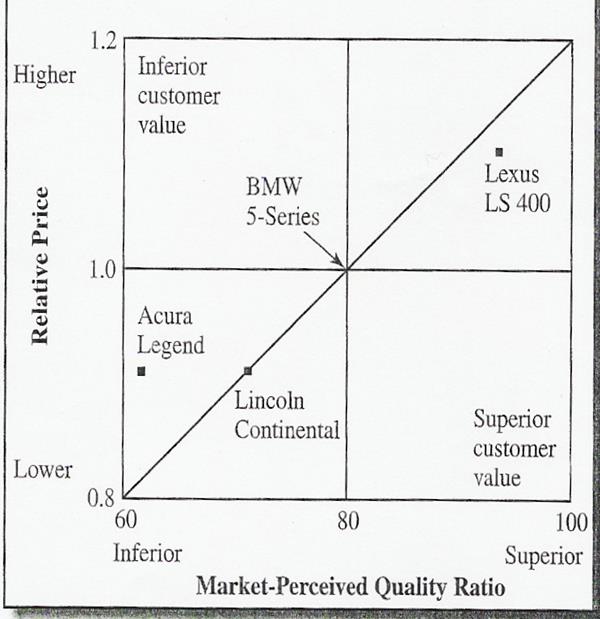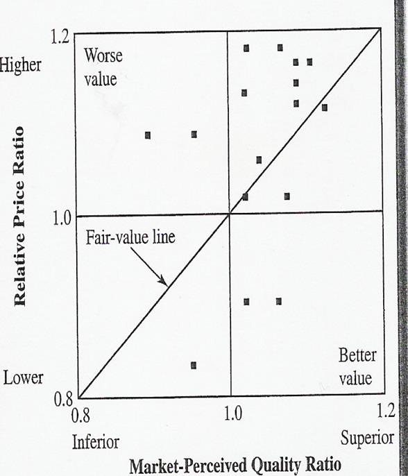 iii. customer value map - this combines the previous 2 profiles into a 4 cell matrix; the market perceived quality profit is on the horizontal axis and the market perceived price plotted on the vertical axis. A 45-degree diagonal value line indicates where quality is balanced against price in a 1:1 ratio. Organisations with positions below and to the right of this fair value line are in the best position to increase market share and their current price levels. On the other hand, organisations with positions above and to the left of the fair value line will probably be losing market share. Furthermore, these organisations need to lower price in order to grow market share. For a premium quality product to earn a premium, the customer must perceive the quality premium to be worth more than the price premium. Customer value maps can be used to analyse strategic a business unit, division, or product/service delivery relative to what rivals are offering. Furthermore, the technique provides a static snapshot of the organisation's competitive position in relation to customer value, and the fair value line can determine the improvements in price and quality that the firm needs to pursue in order to capture more customer value. For example, market specific customer value map ‐ luxury cars