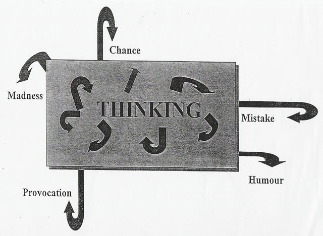 Creativity involves a mindset change and seeing things with different or with "new eyes", ie "thinking outside the box"; ways of thinking outside the box (see diagram below) include chance, mistake, humour, provocation and madness. Remember: