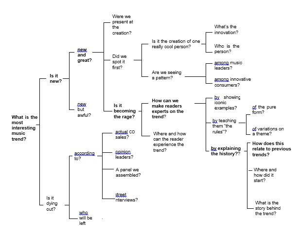 The logic tree begins with a high-level question that is broken down into increasingly specific queries. Often the questions five or six levels down are most fruitful. Such is the case in the example of a music magazine trying to rethink the way it generates story ideas. The questions on the first few branches are quite general ‐ probably the ones the editors would ask every day. But say we move down a branch (as we have here along one particular one in bold), we can see that the questions get more specific and perhaps more original. For example, the question, "How can we make readers experts on the trend?" yields 3 intriguing possibilities that, in turn, lead to further questions that are still sufficiently abstract yet focused enough to work. Following the other branches leads to equally stimulating possibilities.
