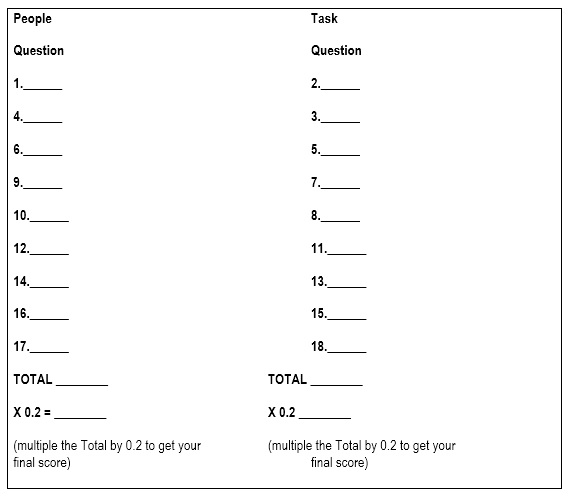 2. Next, have them transfer their answers to the 2 respective columns provided in the scoring section. Total the score in each column and multiply each total by 0.2. For example, in the first column (People), if the learner answered 5, 3, 4, 4, 3, 2, 5, 4, 3 then his or her final score is = 33 X 0.2 = 6.6.