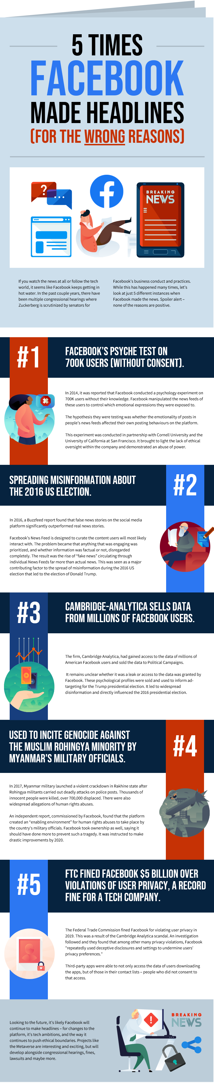 - mis-use of private data, like Cambridge Analytica working on Donald Trump's presidential campaign using private data collected by Facebook