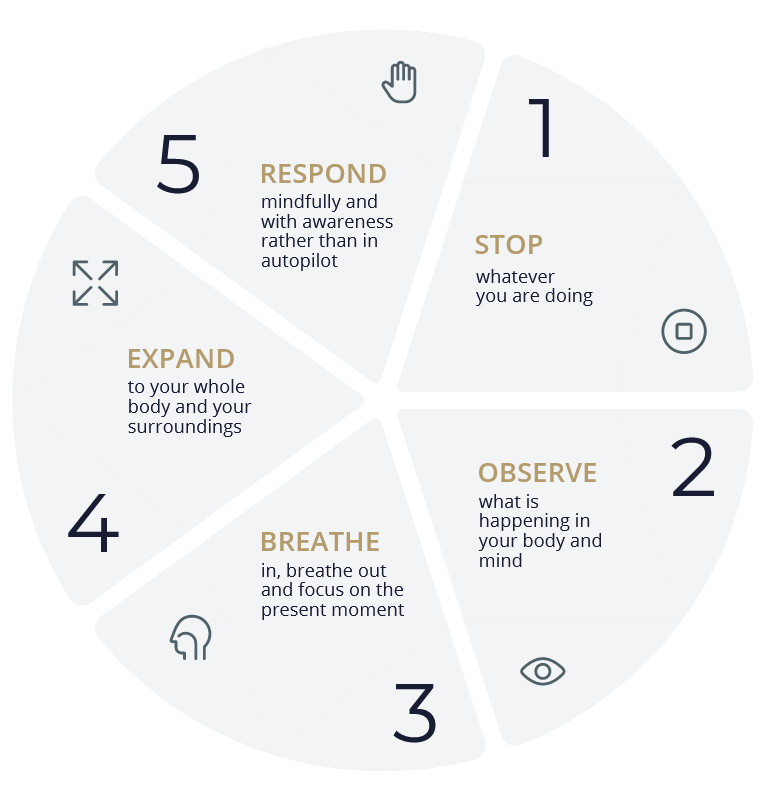 1. Stop (relax your posture so that you are not tense or stiff and allow yourself to be right there in the present moment; the aim is to get yourself out of autopilot, ie your usual reaction to stress)