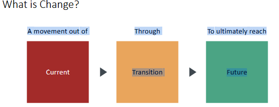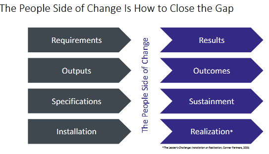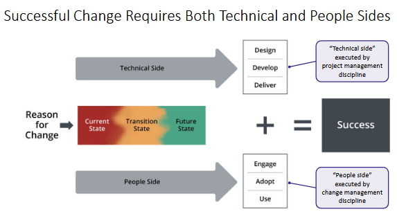 The people side is incorrectly described as the soft stuff. However, like project management, it is based upon research, frameworks, tools, techniques, etc; it is a discipline with systems, processes, rules, etc.; it is more than just training, ie people need to know why are changing; it involves moving people from a current state through a transitional state to a future state: